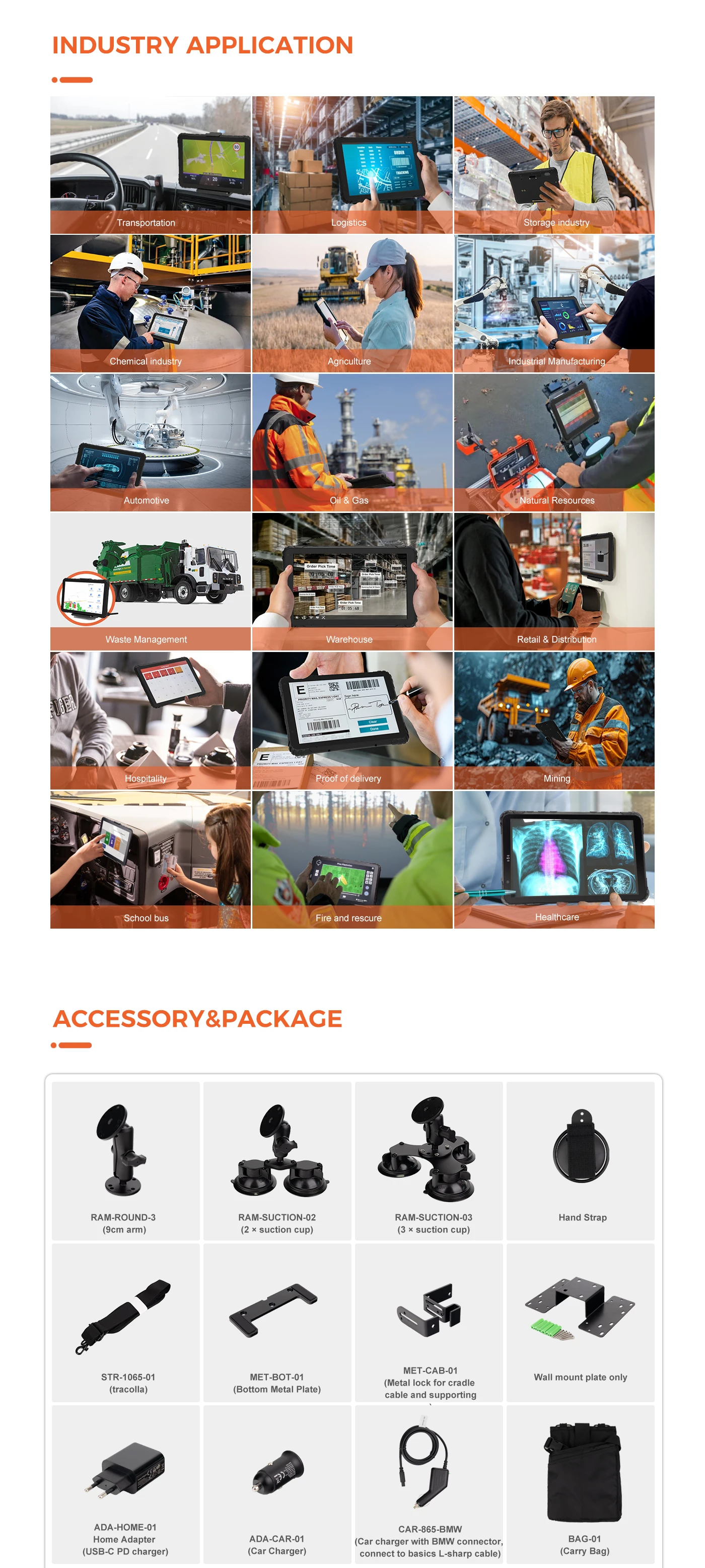 1pc main unit and 1pc cradle(Vehicle cradle or desktop dock station), 1pc RAM Mount, 1pc USB cable , 1pcs High power car charger, 1pc NFC card, 1pcs High power home adapter, 1pcs Type C cable for home adapter
