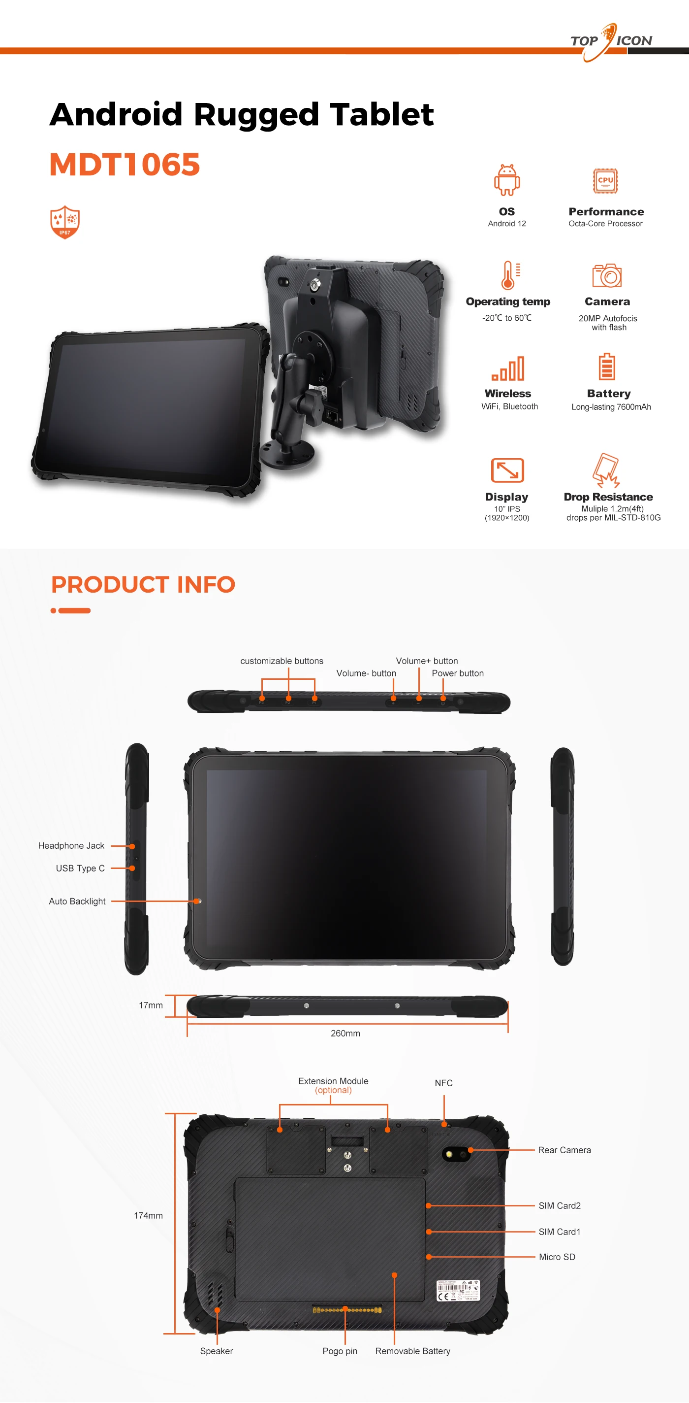 MDT1060/1065 is a high-performance tablet terminal with 10" display, IP67 rated. Equipped with octa core processor, advanced GPS chipset, 4G/3G/WLAN module, with RFID, Bluetooth, camera and support hardware customization. Battery replaceable, can be charging by vehicle or by desktop charging station.