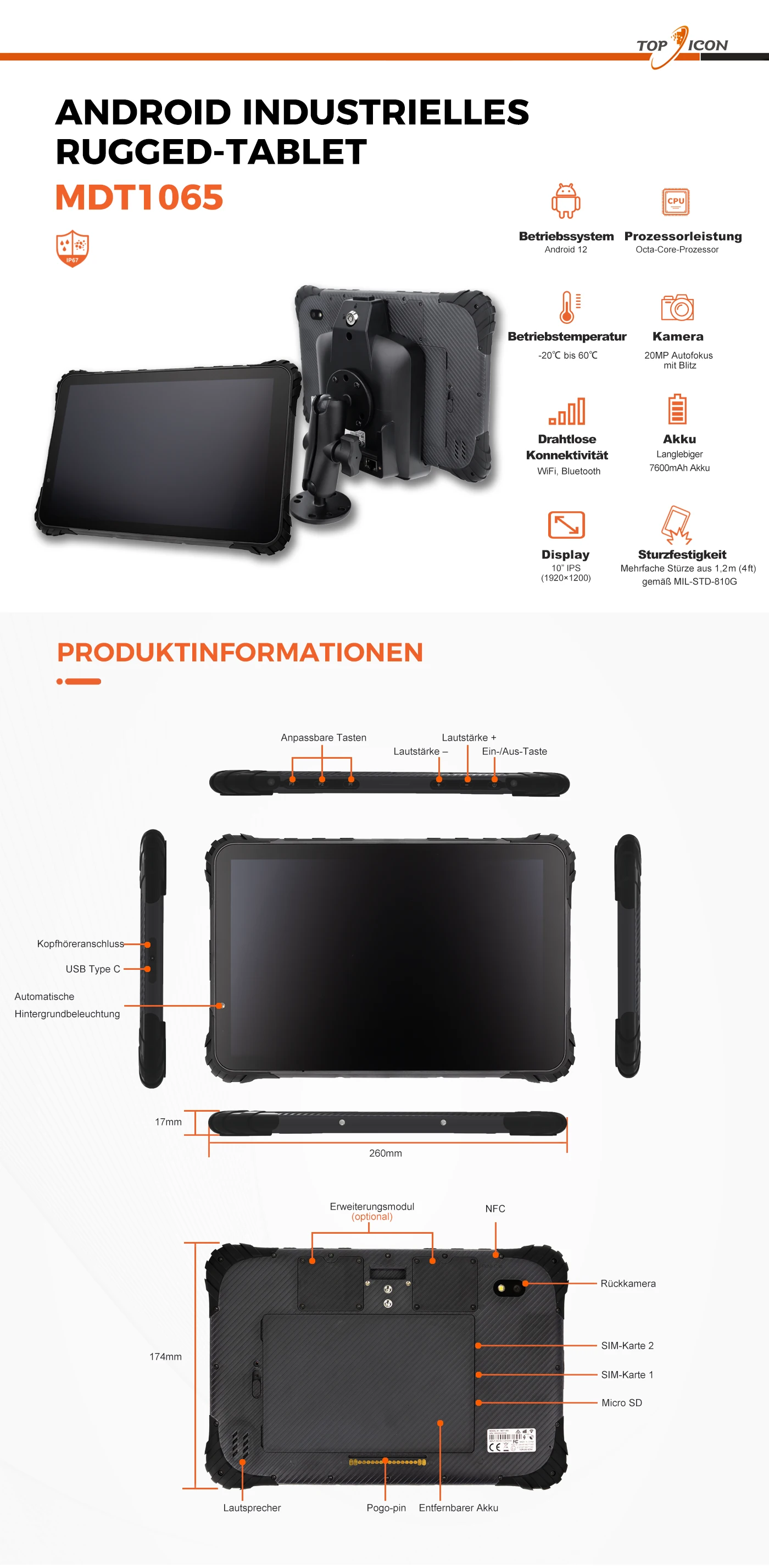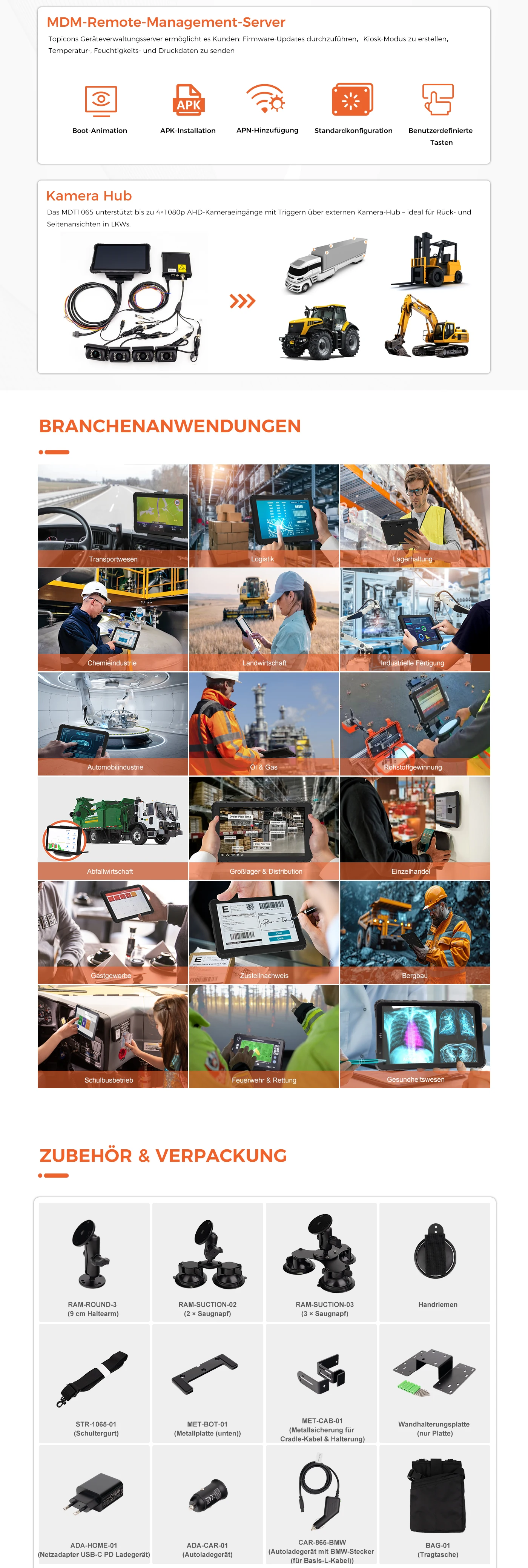 MDT1065 ist ein robustes 10-Zoll-Android-Tablet mit IP67-Schutz. Es ist für Lager, Außendienst und Transport konzipiert und unterstützt Halterungen und Montagelösungen.
